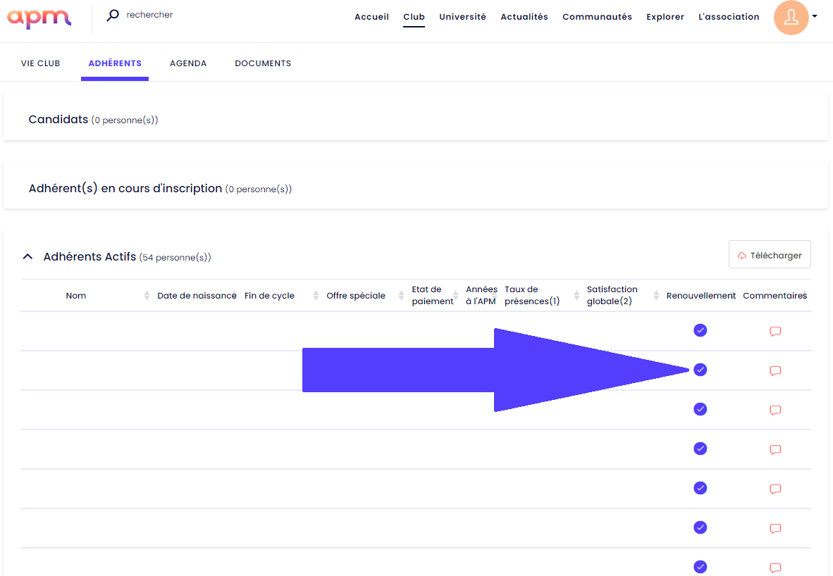 3. Dans la liste des adhérents actifs, décocher la case "Renouvellement" sur la ligne de l'adhérent en question.